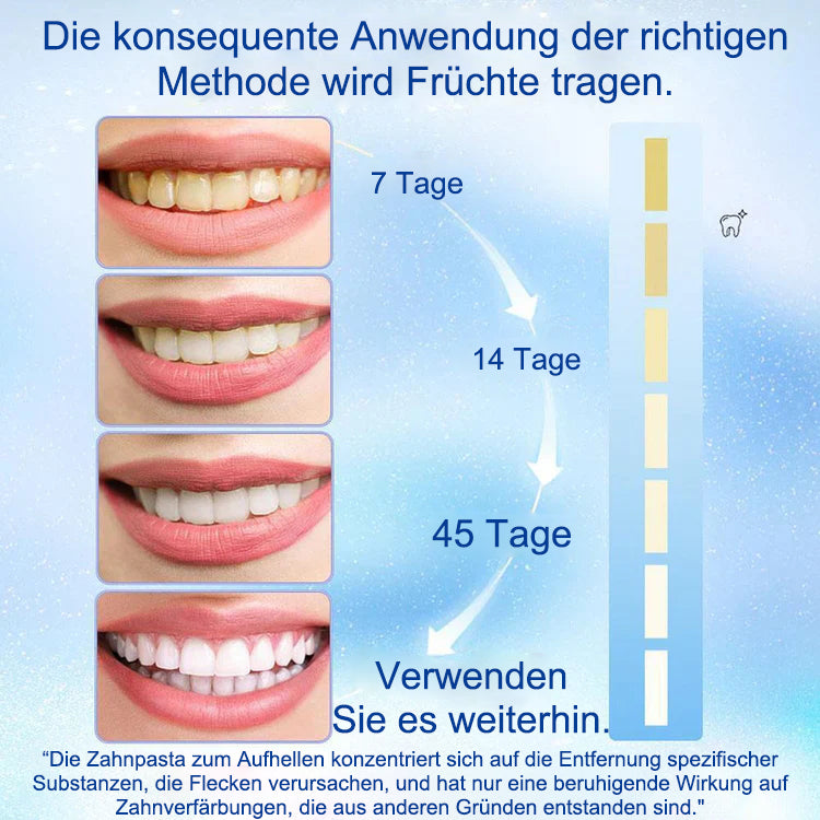 VerfĂ€rbungen von Kaffee, Wein und Lebensmitteln beginnen zu verblassen. Der Zahnschmelz erscheint klarer, das Zahnfleisch fĂŒhlt sich beruhigter an, und das ZĂ€hneputzen wird erfrischender und angenehmer.