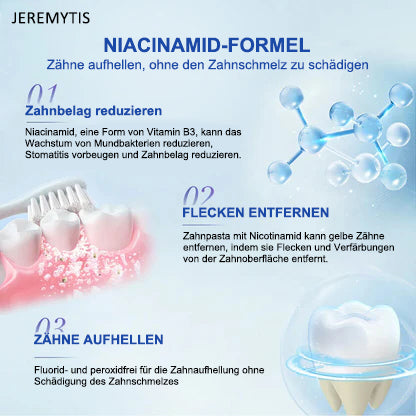 Stellen Sie sich ein LĂ€cheln vor, das nicht nur strahlender, sondern auch gesĂŒnder ist. Ein LĂ€cheln, das den Raum erhellt und Ihr Selbstvertrauen bei jeder Begegnung stĂ€rkt. Sie kennen das GefĂŒhl - das leise Zögern, bevor Sie lachen, die leichte Unsicherheit, wenn Sie jemand Neues kennenlernen. Wie wĂ€re es, wenn Sie sich von diesen Momenten verabschieden könnten und ein LĂ€cheln hĂ€tten, auf das Sie wirklich stolz sind?Wir stellen Ihnen JEREMYTISâą Niacinamide Whitening Toothpaste vor, die revolutionĂ€re Methode zur Zahnaufhellung, die die Kraft der Hautpflege mit sanfter, effektiver Mundpflege kombiniert. Wir wissen, dass Sie mehr wollen als nur weiĂere ZĂ€hne. Sie wollen eine Lösung, die Ihr empfindliches Zahnfleisch schont und sich nahtlos in Ihren geschĂ€ftigen Lebensstil einfĂŒgt.